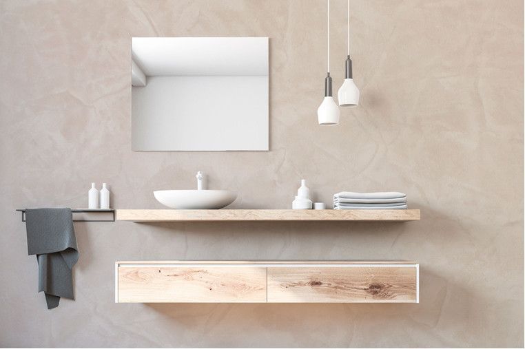 Для создания влагостойкого покрытия, напоминающего внешне венецианскую штукатурку, можно использовать микроцемент. Этот материал позволяет создавать бесшовное покрытие не только на стенах, но даже на полу. Больше никаких некрасивых стыков и швов, со временем становящихся рассадником грибка и плесени в комнатах с повышенной влажностью!