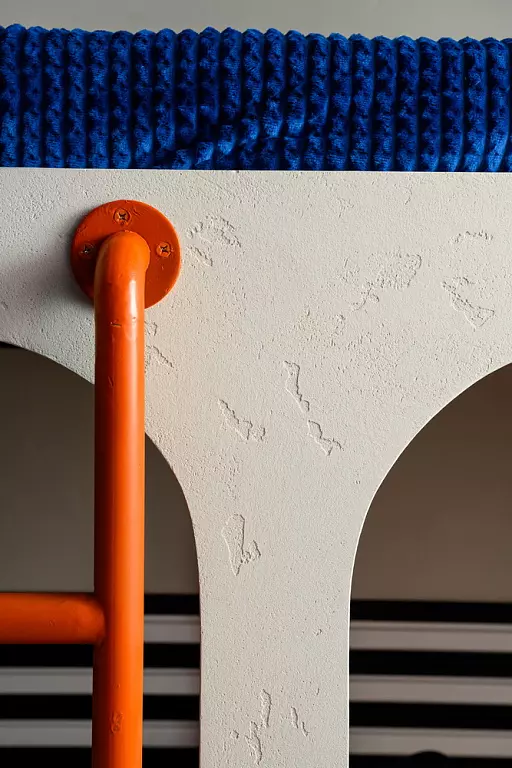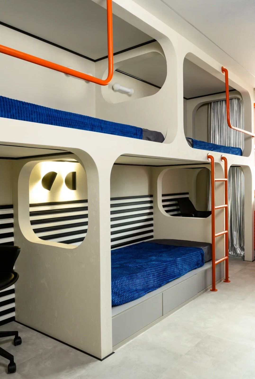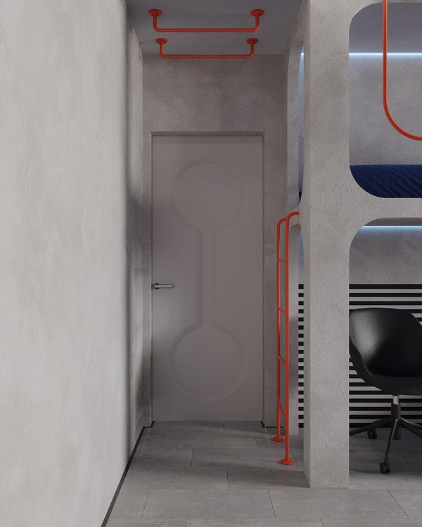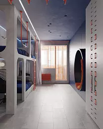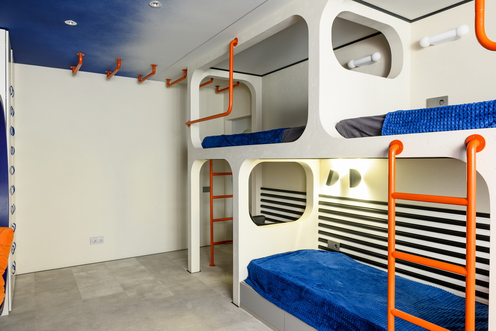 Все стены комнаты, а также кровати - стены "капсул" для сна из гипсостружечной плиты, оформили декоративной штукатуркой Rustic Decorazza, имитирующей бетон. При этом материал наносили в два слоя, что добавило большей фактурности поверхностям. После полного высыхания декоративной штукатурки мастера нанесли лессирующий состав Cera Décor, который визуально помог подчеркнуть эту фактурность и выступил в роли дополнительного защитного слоя. Поверхности будут приятно шероховатыми и при этом выдержат любую влажную уборку.