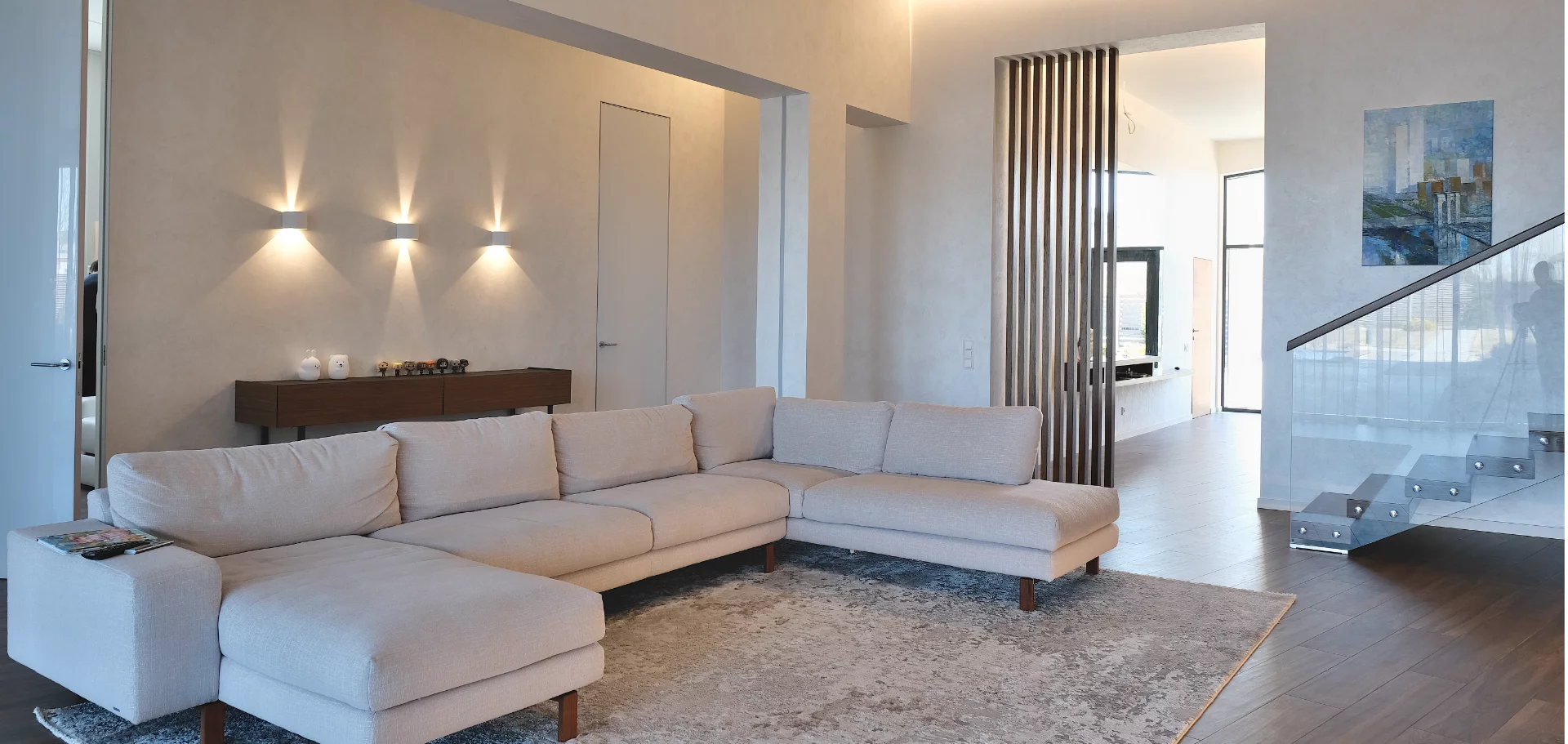 Благодаря Velutto, спокойная, благородная фактура поверхности стен в данном интерьере, не просто подчеркивает красоту архитектурных решений разноуровневого пространства, но и создает монументальное, а вместе с тем легкое и светлое впечатление от конструктивного решения пространства.