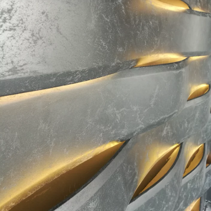 Плавные, изгибающиеся формы стенового рельефа из сплетенных панелей-лент призваны обозначать стелящийся туман или мерцающую дымчатую вуаль