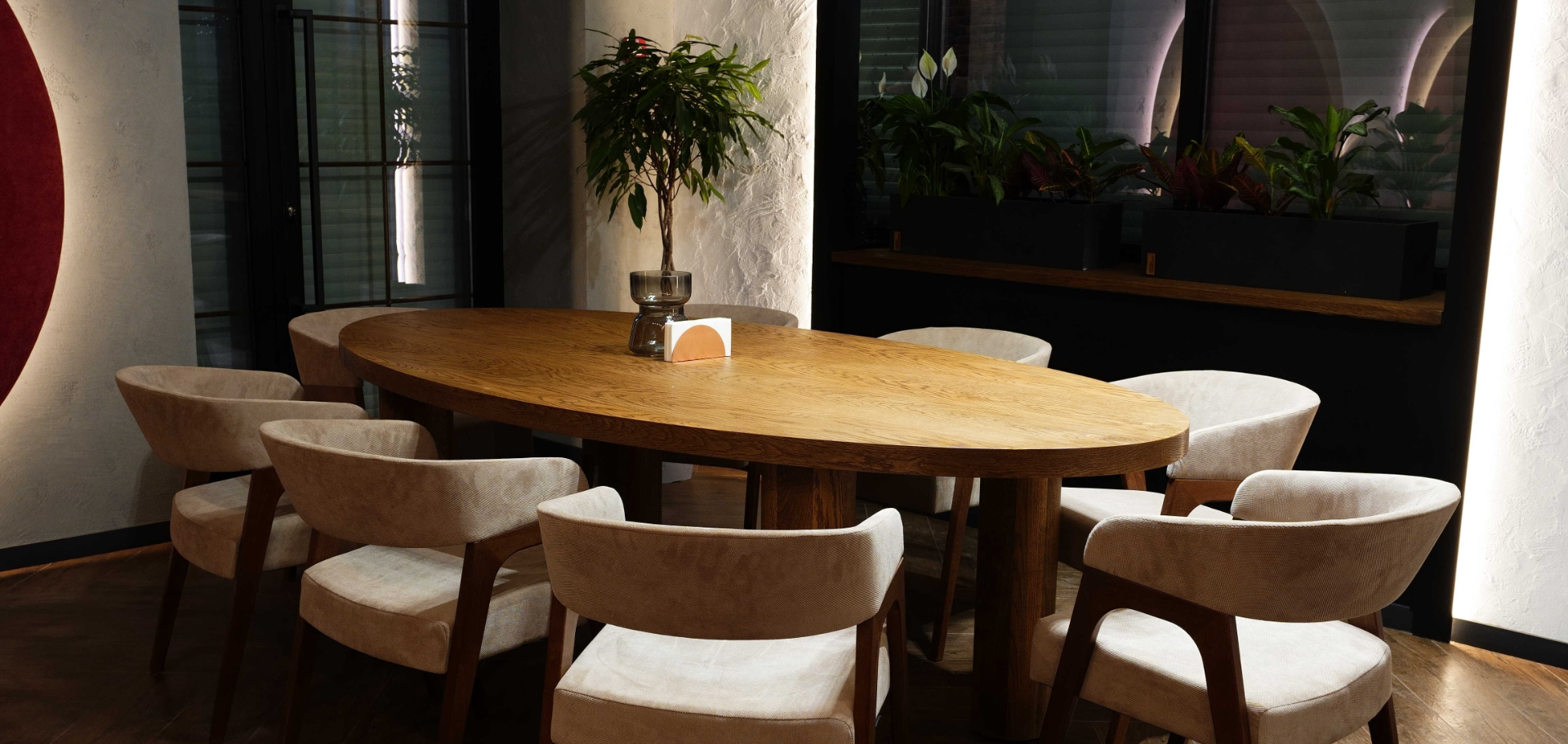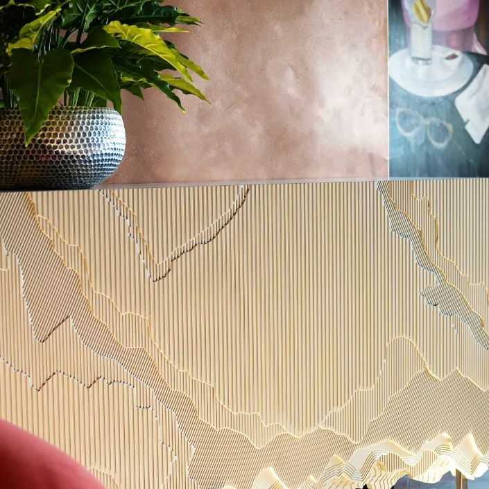 Вы попадаете в настоящую галерею эффектов: ресторан «Культо» можно использовать как полноценный шоу-рум отделочных материалов от Traverta Decorazza. Не только стены, но и скрытые двери, мебельные фасады и даже столешницы могут претендовать на приз за спецэффекты.