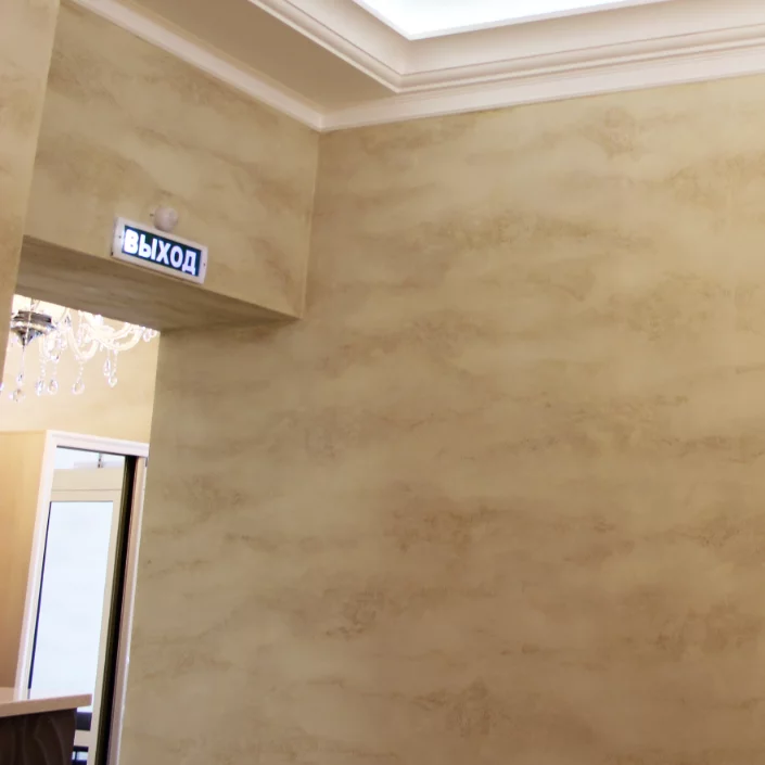 Покрытие Traverta в интерьере отлично сочетается с лепниной и отвечает за европейские качество и традиции. Выдержанная спокойная палитра, выверенный сценарий с визуальными доминантами, останавливающими взгляд на рельефных панно, сияющая латунь светильников и блеск хрусталя вызывают доверие к мастерству не только мастеров отделки, но и врачей.